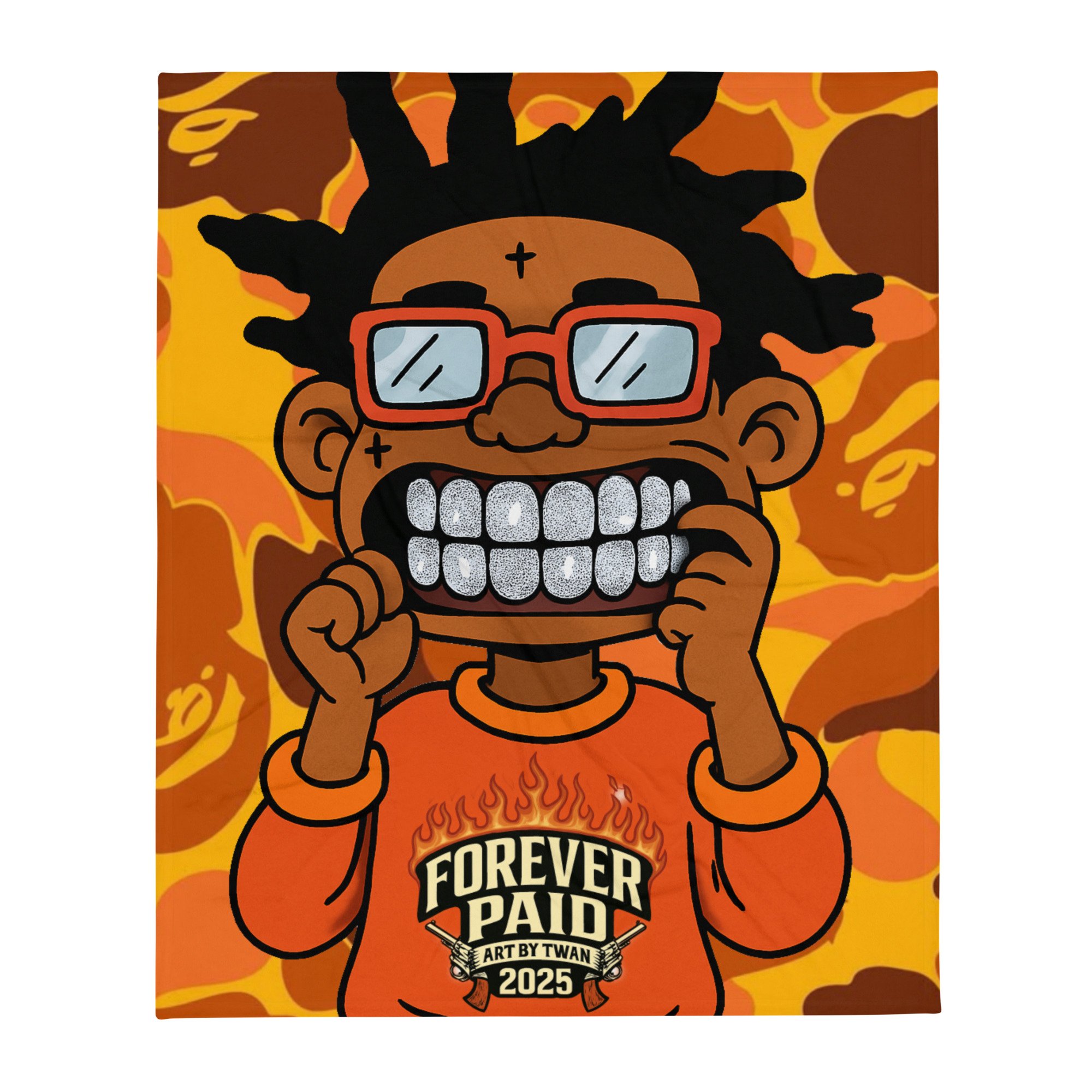 Description: Turn your space into a gallery of grit. This Forever Paid fleece blanket blends bold character art, fiery details, and street-certified confidence. Featuring a custom cartoon by Twan and framed in high-heat orange and gold, it’s not just a blanket—it’s a warm flex. Wall-hang it, couch-drape it, bed-layer it—just make sure it’s seen.